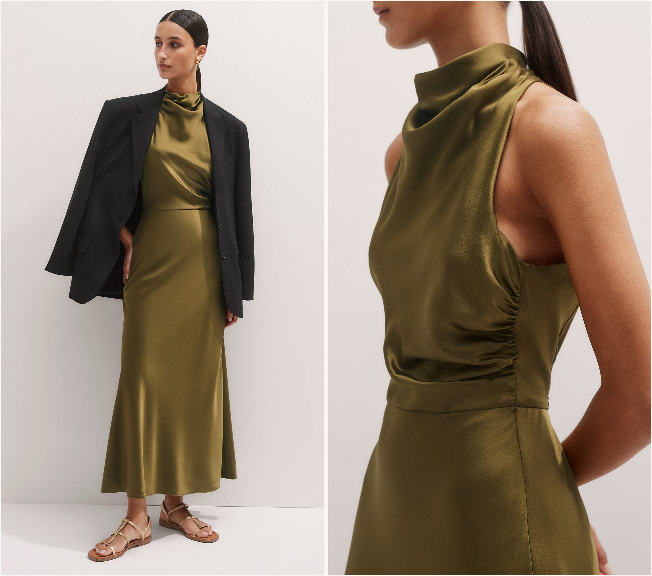 Oversized styles look best when paired with a slim-fitting base. So create contrast by teaming this blazer with the soft fluidity and slim proportions of our bias-cut Draped Halterneck Maxi Dress, crafted from lustrous silk satin.
