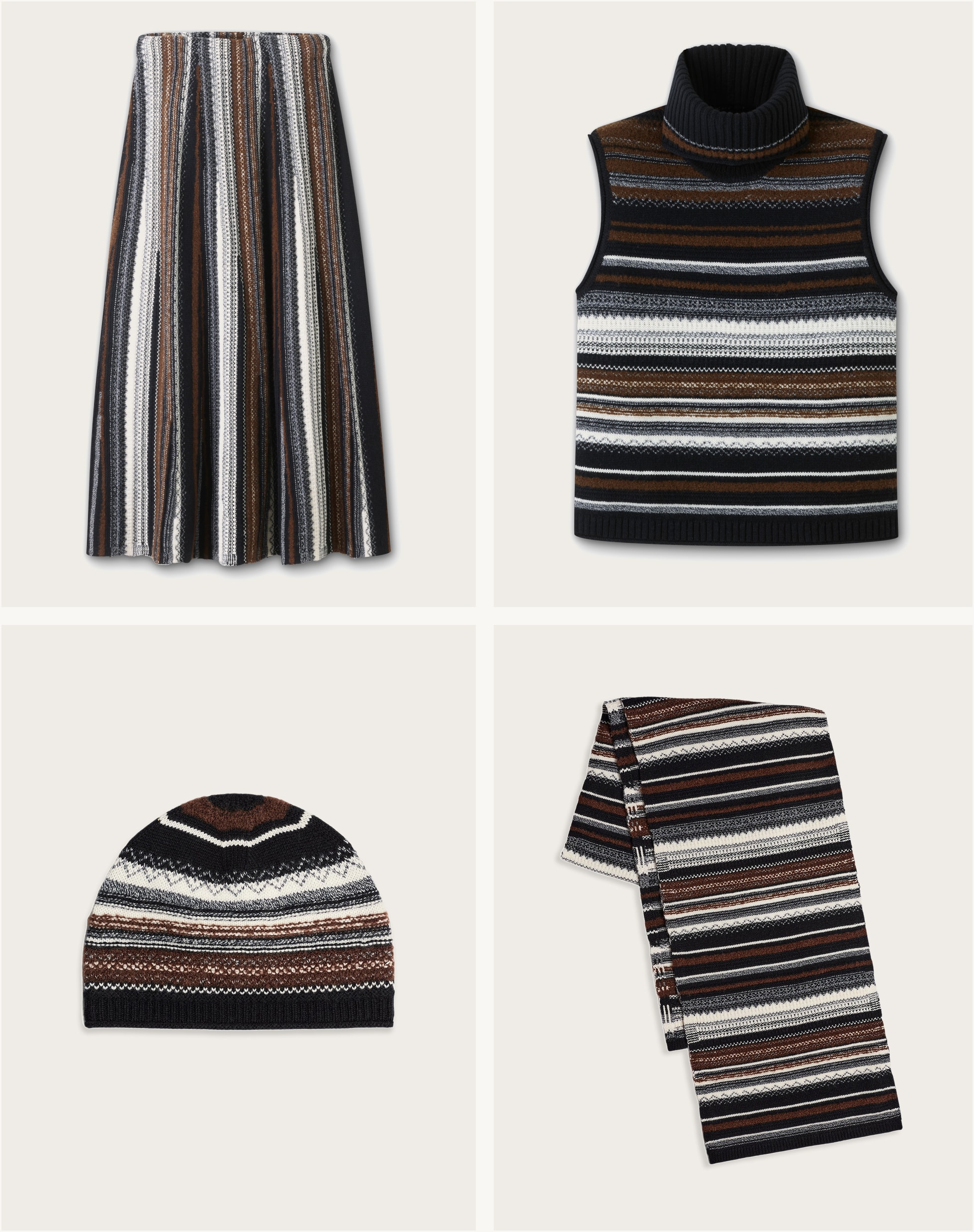 Traveling in knitwear is ideal to combat the unpredictable in-flight AC, so opt for a contemporary co-ord with our Crop Sweater and Triangle Scarf. Or, look to our textured stitch pattern, which is incorporated across a selection of knitted pieces this season. If you’re preparing for a drop in temperature on arrival, then cozy accessories are your best plus one (or carry on). Our Textured Stitch Beanie and Scarf can be worn with the matching Textured Vest + Snood, Sweater or Skirt for a graphic finish that locks in warmth.